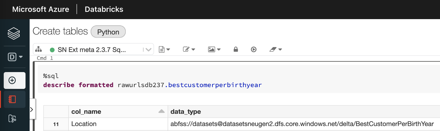 This requires that the different workspaces and the clusters have read access to the data. When working with a shared metastore we should use direct access to the data lake i.e. not using mounts to access the data as mounts can differ from workspace to workspace. If we query info about a table registered in the metastore we can look at the location for the data behind the table (direct access URL):