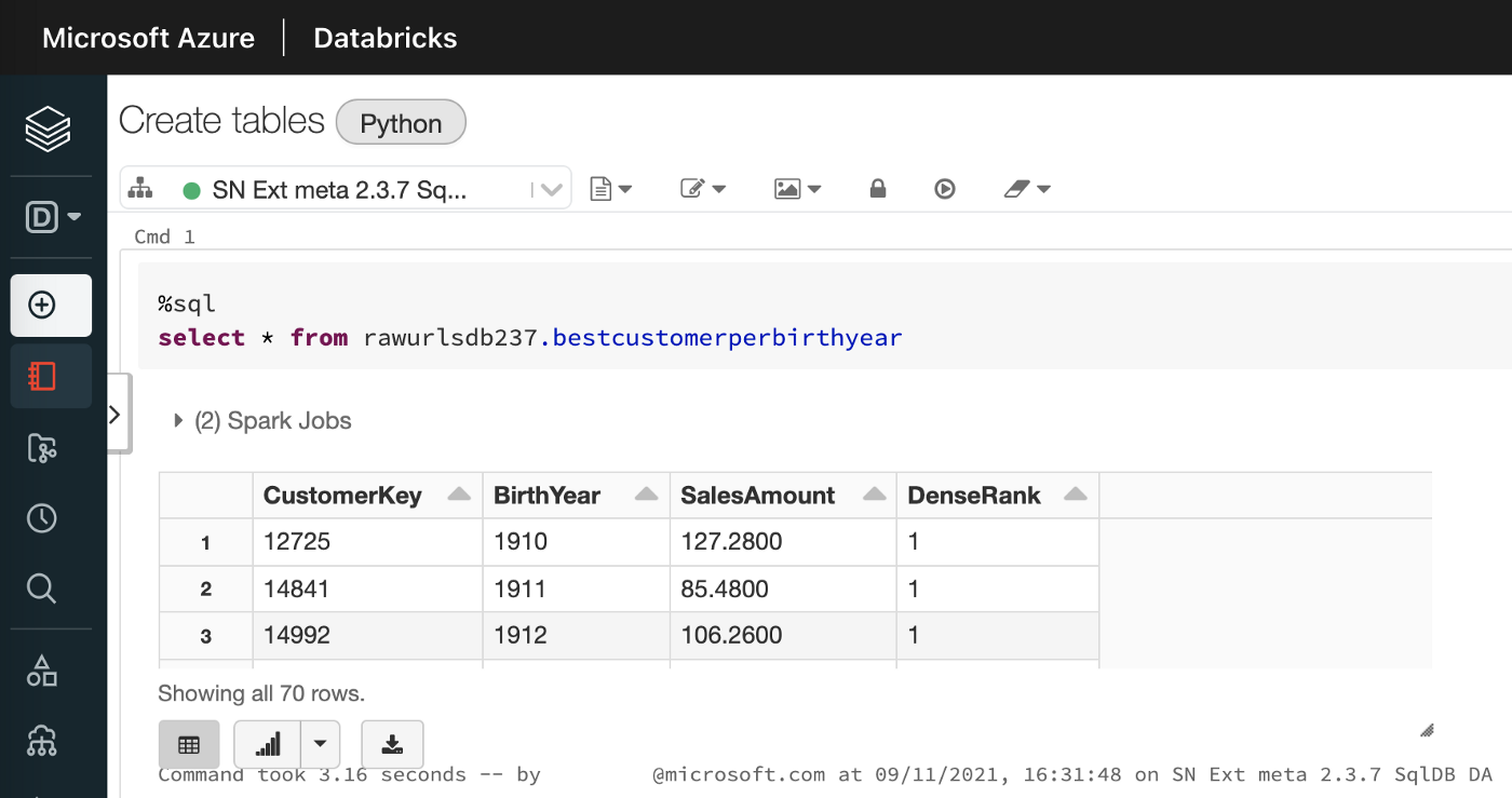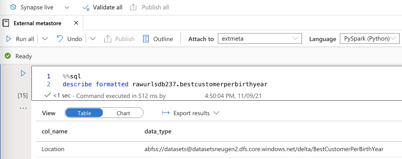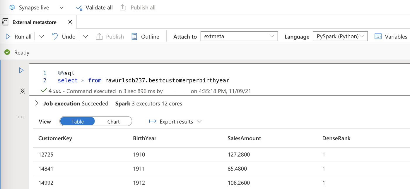 Using the same metastore to query the same table in a Synapse Spark Pool: